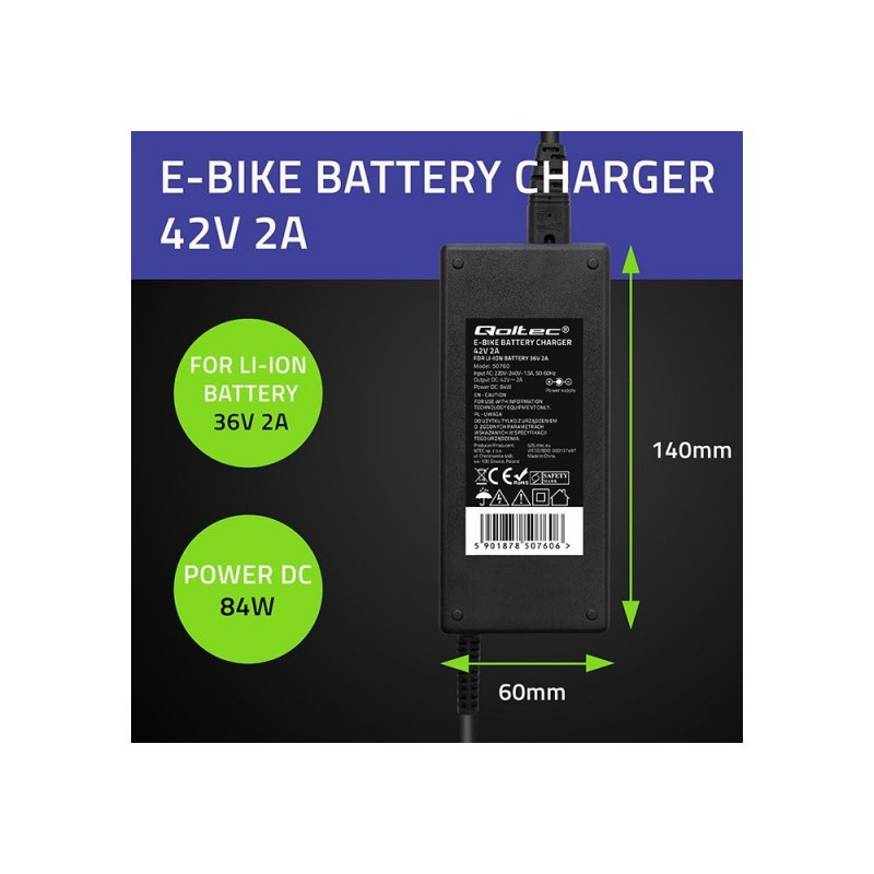 The Qoltec mobile charger of 42V and 2A charging current with a 5.5*2.1 plug and an overall charging power of 84W dedicated to 36V lithium-ion batteries, allows you to charge your battery from any 230V electrical outlet. This convenient and functional solution with advanced electronics, protects your battery during the charging process. Equipped with an LED that turns green when the battery is charged.