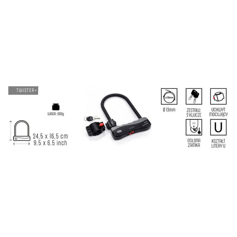 Zapięcie rowerowe Meteor Twister+ to solidnie zabezpieczenie roweru przed kradzieżą. Model w stylu U-locka wykonany z hartowanej stali. Całość pokryto warstwą tworzywa sztucznego. U-lock Meteor Twister+ wyposażono dodatkowo w blokadę na klucz. W zestawie uchwyt mocujący, który umożliwia wygodne transportowanie zapięcia na rowerze.
