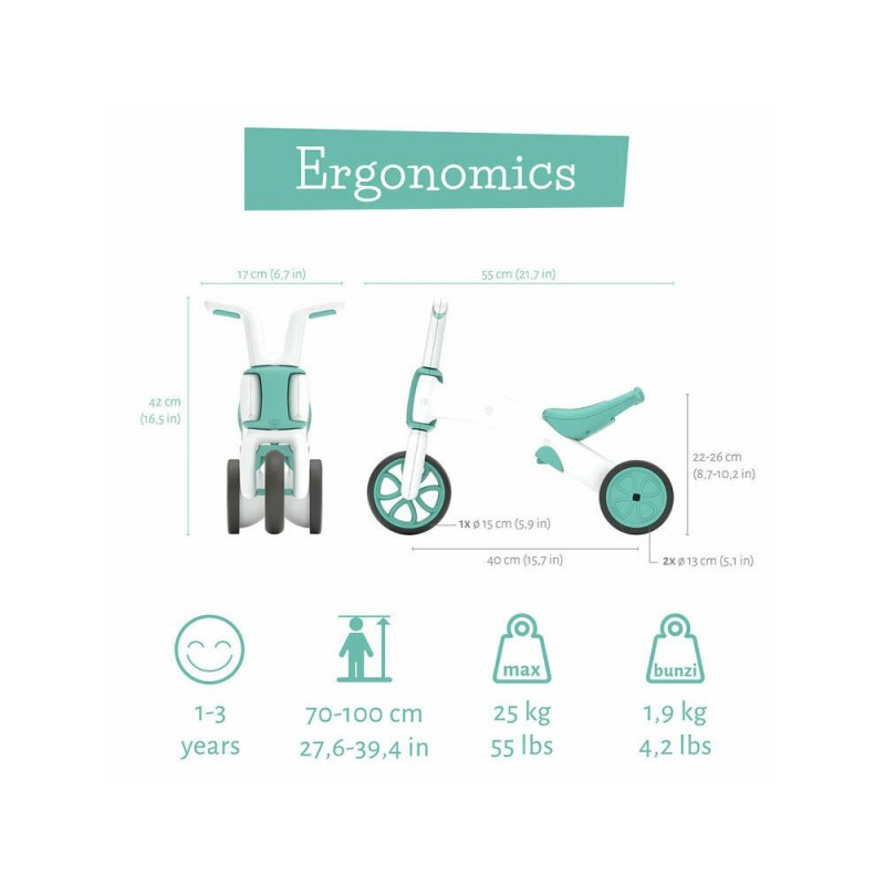CHILLAFISH CPBN03MIN is an innovative 2-in-1 balance trike and bike, designed for children aged 1 to 3 years. This model helps toddlers gradually develop balance and coordination skills by transitioning from a stable three-wheel mode to a more challenging two-wheel setup.