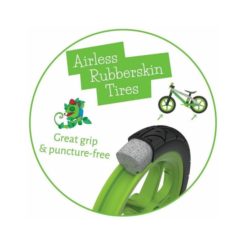 12-inch airless RubberSkin tires: Offer great grip and require no inflation.