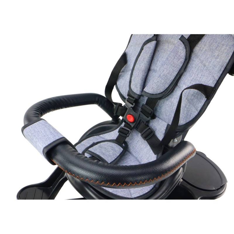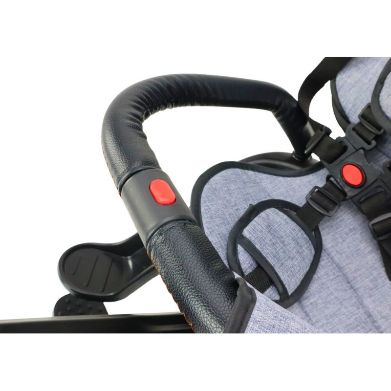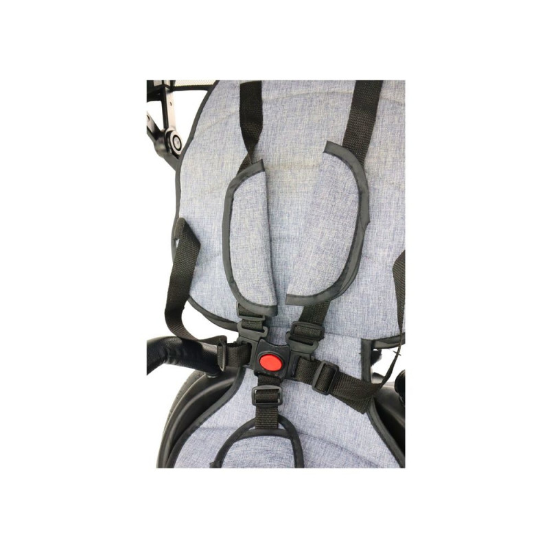 - możliwość kierowanie przez rodzica prowadnikiem,- blokadę tylnych kół, czyli hamulec postojowy,- 5-punktowe pasy bezpieczeństwa,- duże koła z pompowanymi gumowanymi oponami,- baldachim z filtrem UV, chroniący dziecko przed słońcem,- podnóżki dla mniejszych dzieci, które łatwo można zdemontować,- obrotowe siedzisko umożliwiające zwrócenie twarzy dziecka w kierunku opiekuna,- możliwość modyfikacji sprzętu w zależności od potrzeb i rozwoju dziecka.