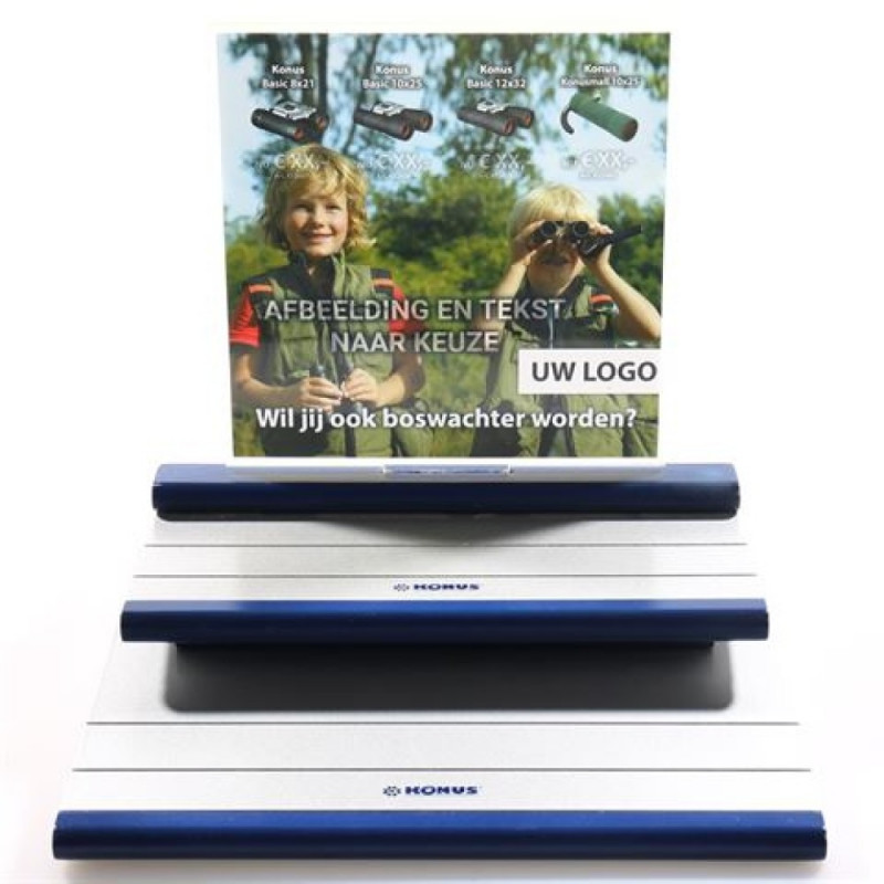 This set consists of 20 binoculars and a binocular display with personalized features. Four different binoculars are supplied, which you can mount on the binoculars display. On the display is a photo of your choice, with your own logo and your chosen sales prices. An extra low purchase price makes it possible to make a nice margin on the binoculars. After ordering we will contact you to discuss your wishes.
