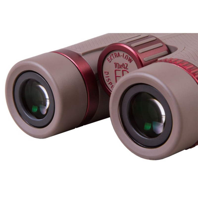 Levenhuk Monaco ED 10x42 are premium class field binoculars. Inside these binoculars, there are optics made of extra-low dispersion glass and multiple-element eyepieces and objective lenses. The binoculars come in a shock-proof shell that is impervious to extreme conditions. These binoculars are excellent for observing wild animals, birds, or urban and countryside landscapes. You can use Levenhuk Monaco ED 10x42 on the water or close to it as well as during rain or snow. The binoculars will become a true treasure for those who enjoy camping trips, traveling, fishing, or hunting.