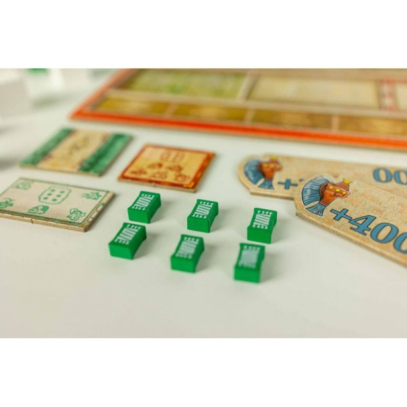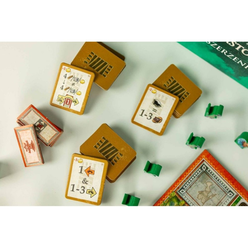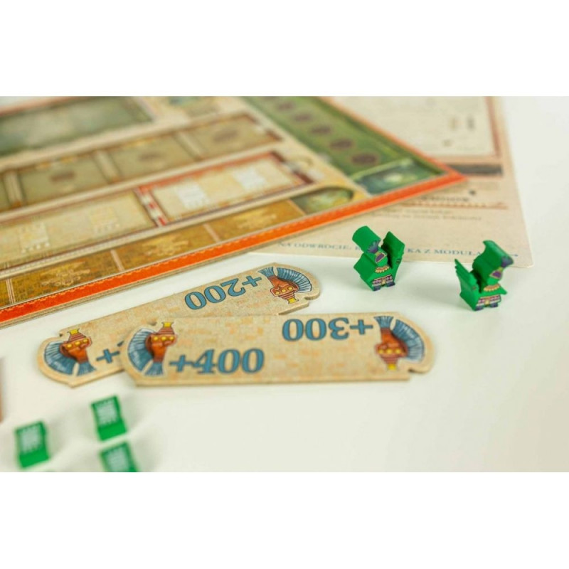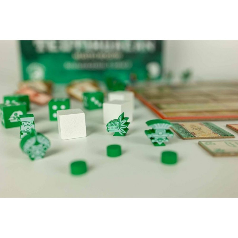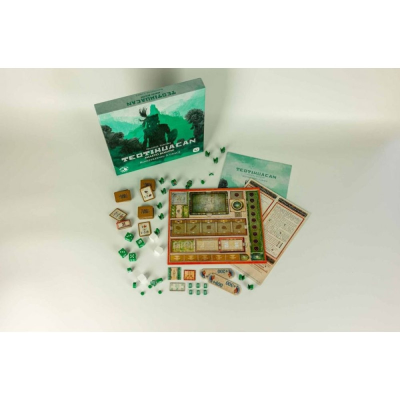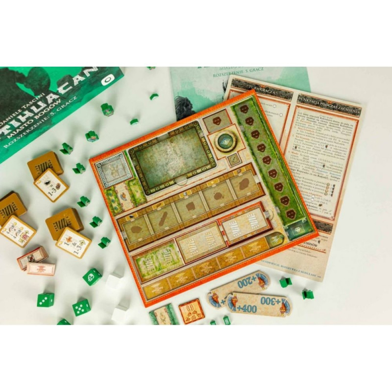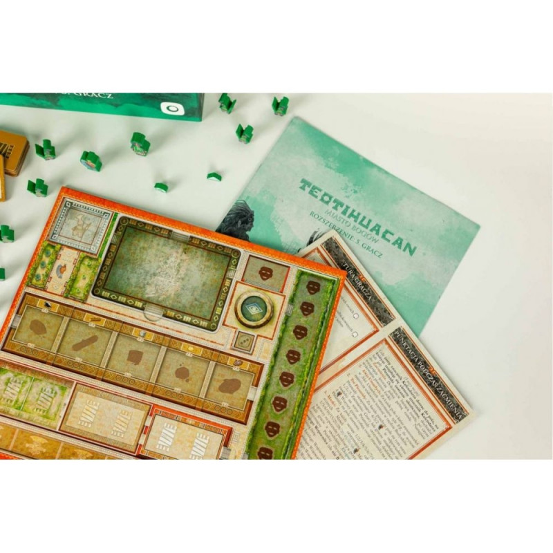 Rozszerzenie: 5. gracz wprowadza do Teotihuacan nowy kolor gracza - zielony - wraz z pełnym zestawem komponentów, który umożliwi wam rozgrywkę w pięcioosobowej grupie oraz nowy moduł gry - Siła Robocza, do wykorzystania w rozgrywkach na 2-5 graczy.
