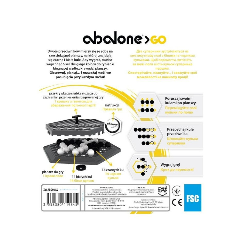 - Podobnie jak klasyczne gry logiczne takie jak szachy, warcaby czy GO, Abalone perfekcyjnie łączy proste zasady i głębię strategicznych możliwości.