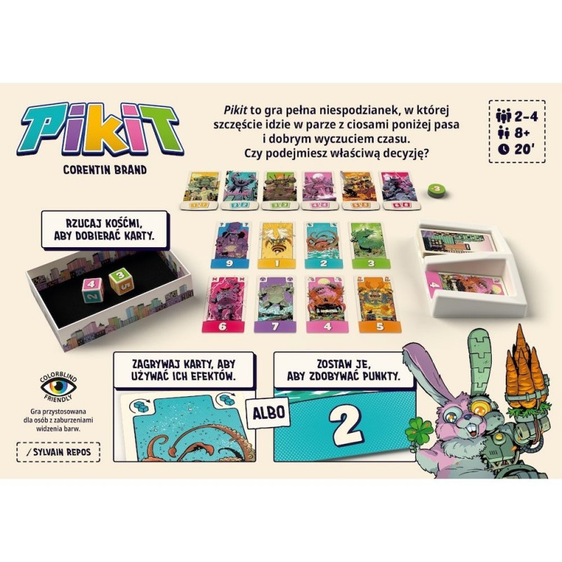 Rzucaj kośćmi, by dobierać karty, i wybieraj, czy wolisz je zagrać (i skorzystać z efektów) czy zachować. Pikit to prosta gra karciana pełna niespodzianek, w której szczęście idzie w parze z ciosami poniżej pasa i dobrym wyczuciem czasu. Szybko okaże się, czy potrafisz podejmować właściwe decyzje!