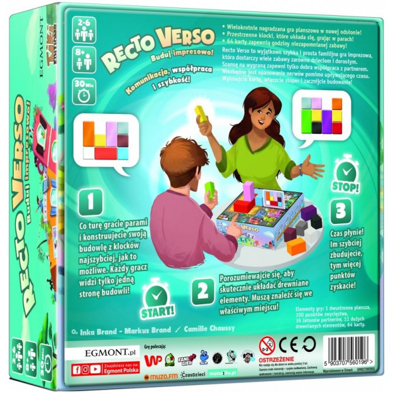 Recto Verso to wyjÄtkowo szybka i prosta familijna gra imprezowa, ktĂłra dostarczy wiele zabawy zarĂłwno dzieciom jak i dorosĹym. SzansÄ na wygranÄ zapewni tylko dobra wspĂłĹpraca z partnerem. NiezbÄdne jest opanowanie nerwĂłw pomimo upĹywajÄcego czasu. Wylosujcie kartÄ, wĹÄczcie stoper i zacznijcie budowanie!