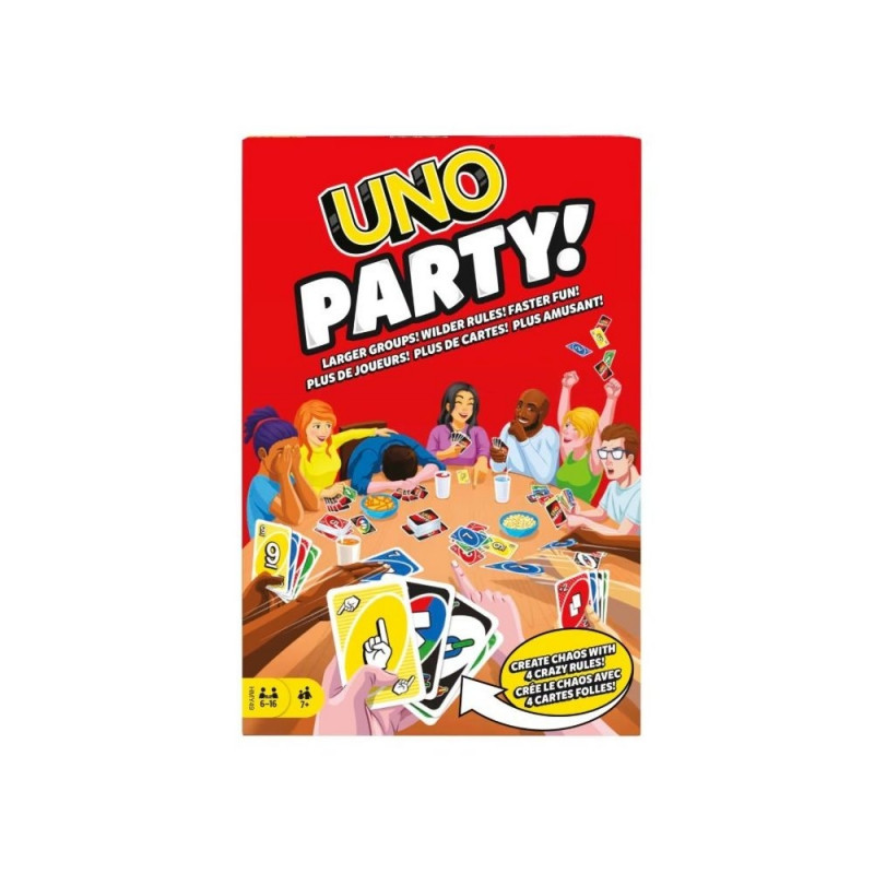 Zbierz wszystkich do rozgrywki w UNO Party. Gra się w nią tak samo jak w znaną i lubianą, klasyczną grę UNO, z wyjątkiem kilku specjalnych kart i reguł stworzonych z myślą o większych grupach, aby rozruszać każdą imprezę. W tej wersji są reguły nakazujące graczom przekazywanie sobie kart do momentu, aż ktoś nie będzie mógł dalej grać, pozwalające wskazywać, kto ma dobrać karty, i łączące w parę graczy, którzy muszą jednocześnie dobrać karty. Jest nawet reguła Szybka rozgrywka. Przeznaczona dla 616 graczy od 7 roku życia gra UNO Party świetnie sprawdza się na wieczór gier z rodziną lub przyjaciółmi.