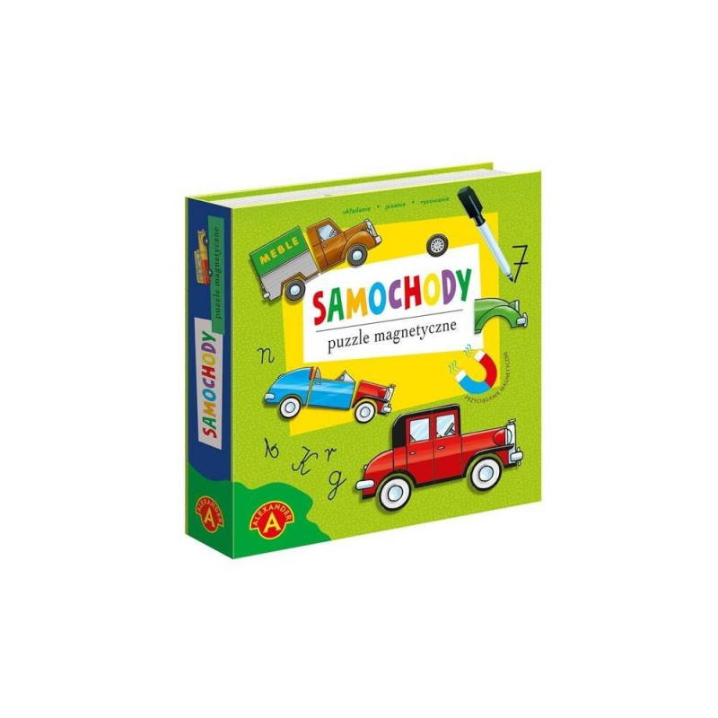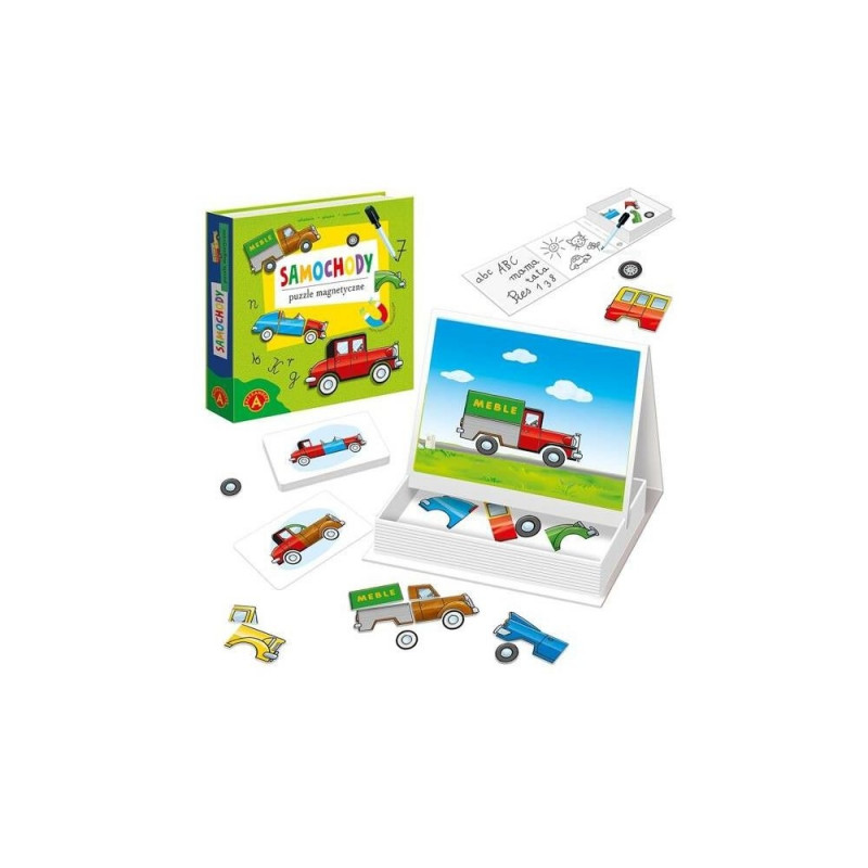 Puzzle magnetyczne - Samochody - to wyjątkowa zabawka dla wszystkich małych wielbicieli układanek oraz aktywności twórczych. Produkt składa się z opakowania w postaci skrzyneczki, zaopatrzonej w magnetyczną planszę do której można w dowolny sposób mocować 41 elementy przedstawiające różne fragmenty samochodów.W zestawie znajdziemy 8 kart z wzorami, podpowiadającymi jaki obrazek odwzorować, ale nic nie stoi na przeszkodzie, aby mail twórcy dawali upust swojej wyobraźni i tworzyli własne, odjechane modele aut.