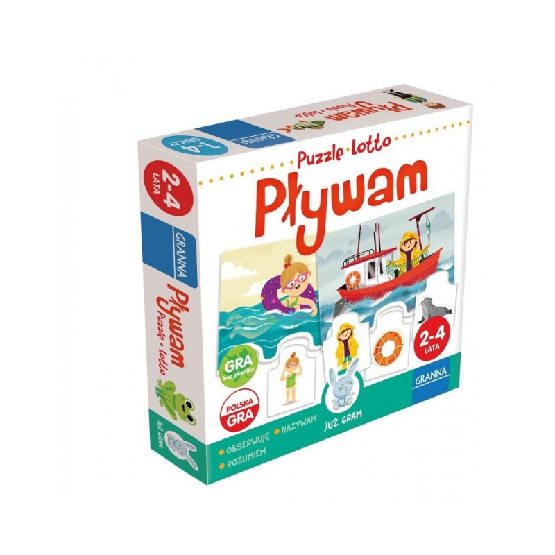 Pływam to puzzle, loteryjka i memory w jednym pudełku. Gra pobudza ciekawość i wyobraźnię, wzbogaca słownictwo, jest znakomitym treningiem spostrzegawczości i pamięci. Ciekawe i kolorowe ilustracje inspirują dzieci do zdobywania wiedzy o świecie. Tym razem w roli głównej: kajak, motorówka, żaglówka, kółko do pływania, kuter rybacki i kombinezon nurka.