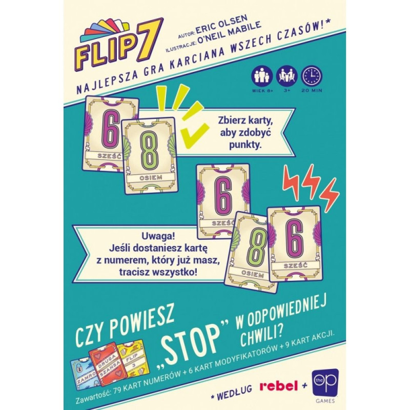 Flip 7 to niezwykle prosta gra karciana oparta na kuszeniu losu. W każdej turze decydujemy, czy podejmujemy ryzyko, próbując powiększyć nasz dorobek punktowy, czy też wolimy spasować i zachować to, co już udało nam się zebrać. Zwycięzcę wyłonimy, gdy ktoś przekroczy 200 punktów, więc czeka nas emocjonujący wyścig pełen niespodziewanych zwrotów akcji!