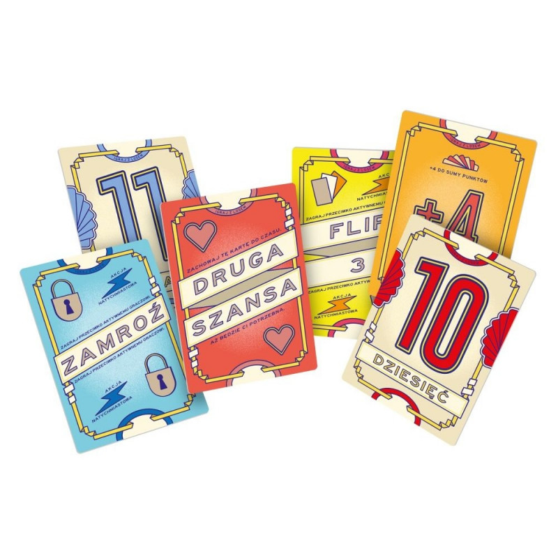 - Do zabawy wykorzystujemy specjalną talię kart z liczbami. Im większa liczba na karcie, tym więcej egzemplarzy tej karty znajduje się w talii. Oprócz tego kryją się tam specjalne karty modyfikatorów, które powiększają nasz dorobek punktowy, a także 3 rodzaje kart akcji, które mogą uratować nas w kryzysowej sytuacji, zmuszą jednego z graczy do dobrania aż 3 kart na raz albo pozwolą natychmiastowo zamrozić czyjąś rundę.