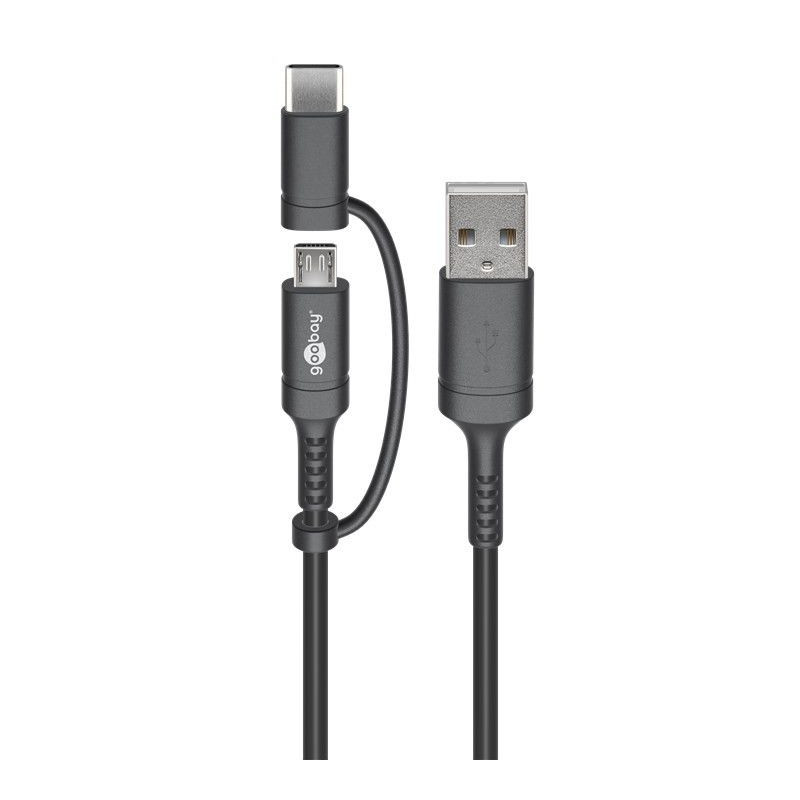 2in1 USB cable with Micro-B cable and USB-C plug 1m, black