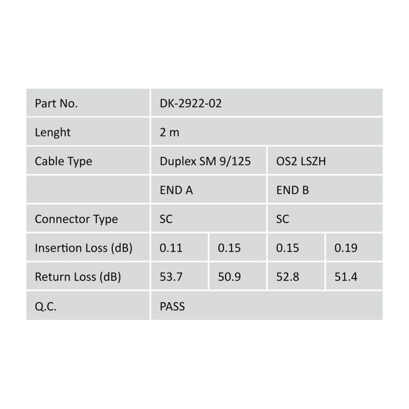 | Muud funktsioonid | Cable diameter 3 mm; Cable type: I-VH 2E9/125µ; Fiber diameter: 09/125µ; Connector 1/2: SC/SC |