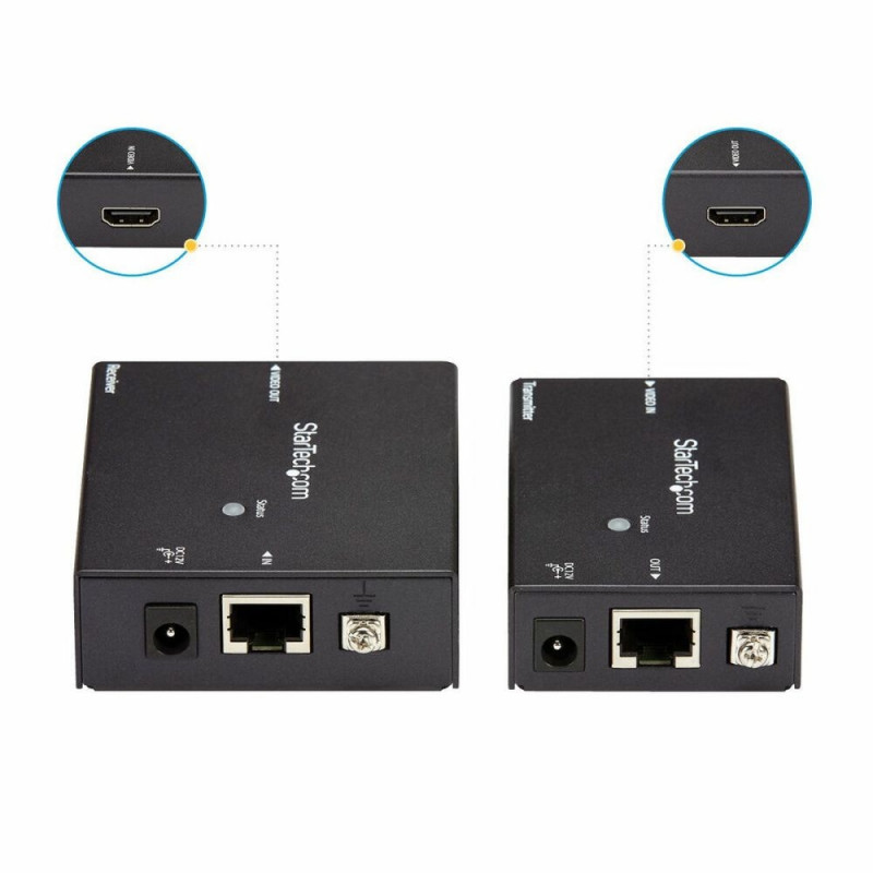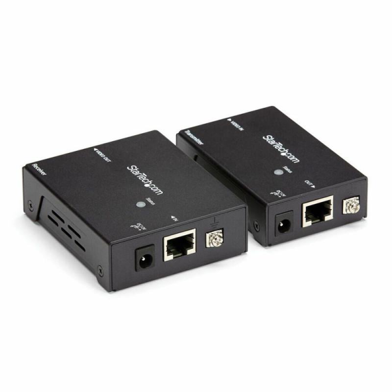 The Startech ST121HDBTE adapter is an HDMI extender that allows transmission of digital video and audio signals over long distances using a single Cat5e or Cat6 cable, with a range of up to 70 meters. Thanks to HDBaseT technology, this device offers uncompressed HDMI signal distribution with zero latency, supporting Ultra HD 4K (4096 x 2160 pixels) resolutions, as well as 3D and digital audio, ensuring exceptional image and sound quality even in large buildings or professional installations such as shopping centers, hospitals, schools, or stadiums. Its compact black design and aluminum casing facilitate discreet and durable integration. The Power Over Cable (POC) system stands out, allowing both transmitter and receiver to be powered through a single power source, optimizing installation in environments with limited power outlets and reducing necessary cabling. It operates with an input voltage of 110-240 V AC and a working voltage of 12 V with 0.5 A current, offering flexibility and stability for prolonged use. Its compact dimensions—67 mm width, 80 mm depth, and 25 mm height—along with included mounting hardware, enable professional wall or rack installation. This extender is a highly reliable and efficient solution to extend HDMI signals without quality loss, using existing cabling infrastructure, ideal for professional audiovisual systems requiring secure, simple, and high-definition long-distance connectivity.