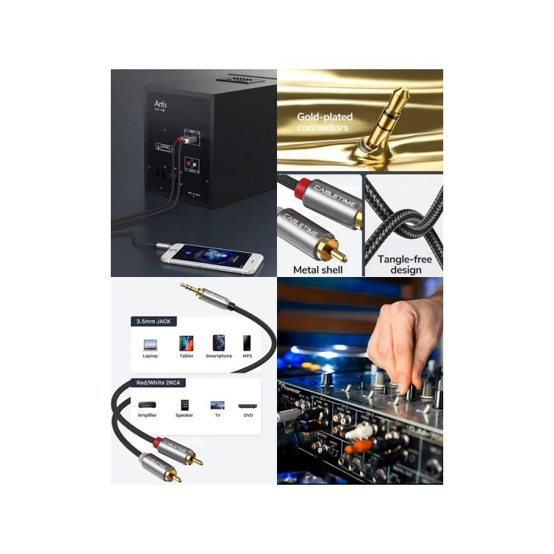 - The cable is used for audio (stereo) signal transmission, connects a standard 3.5 mm headphone jack with two RCA jacks.