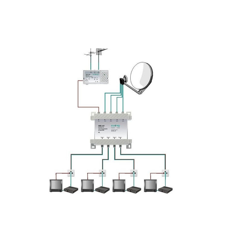 Sumator pozwala zsumować sygnał z konwertera Quad z sygnałem TV naziemnej i przesłać go do czterech gniazd RTV SAT. Sumator posiada bardzo rozbudowaną filtracje na poszczeglnych wejściach, dlatego urządzenie posiada b. dobrą separacje pomiędzy wejściami SAT i TV.Konwerter Quad jest zespołem czterech konwerterw fullband umieszczonych w jednej obudowie. Każdy z tych konwerterw ma oczywiście możliwość oddzielnego sterowania. Dlatego do do instalacji można podpiąć cztery niezależnie pracujące tunery satelitarne. Instalacja umożliwia także dostęp do sygnałw TV naziemnej.
