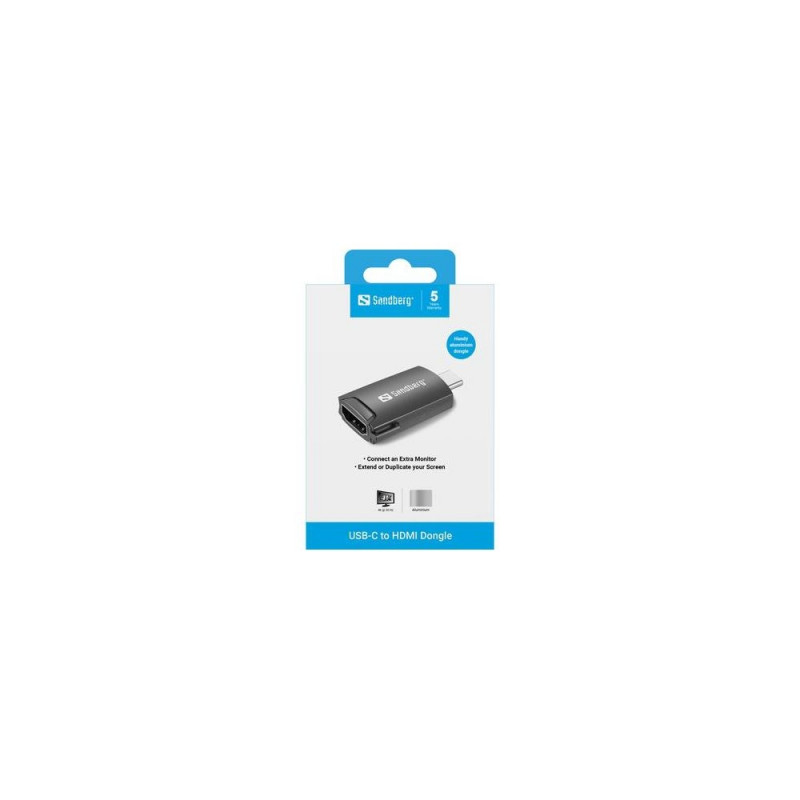 Sandberg USB-C to HDMI Dongle allows you to connect an extra monitor, a TV or a projector to your device.Sandberg USB-C to HDMI Dongle. Maximum resolution (HDMI): 3840 x 2160 pixels. Product colour: Black, Housing material: Aluminium. Package width:Product has been archived