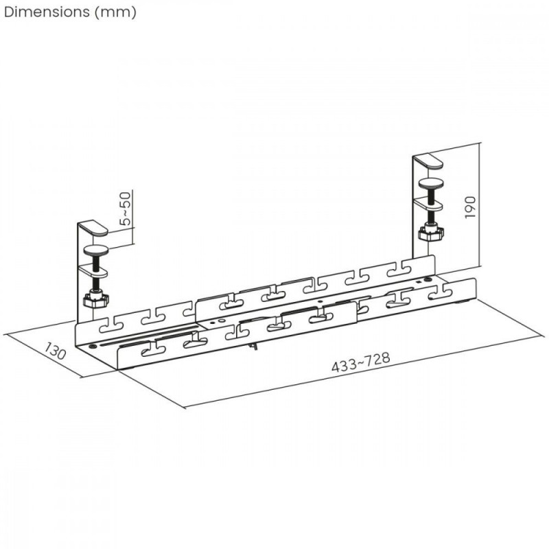 Keep your workspace neat and tidy with the under-desk cable strip organizer. This practical holder, with an adjustable length from 433 to 728 mm, allows you to fit a variety of countertop sizes and power strip lengths. It allows you to organize cables and fix the power strip without drilling or permanently interfering with the furniture. Thanks to the clip-on mounting system, it can be easily attached to the countertop and also quickly removed or moved if necessary. The organizer is great for the home office, gamer's room or workplace.