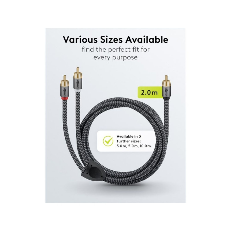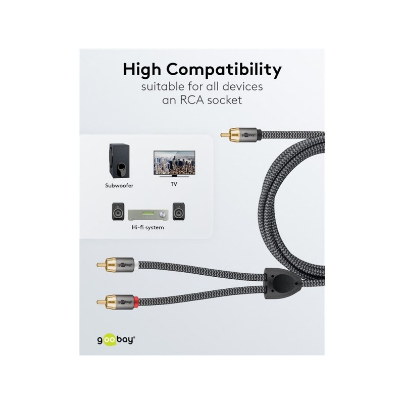 | Description | The Goobay Plus series comes in a slim, elegant metal design in Sharkskin Grey. The RCA cable is specially tailored to the analogue low-frequency signals of subwoofers - for a rich, powerful bass response and an impressive music and movie experience. |