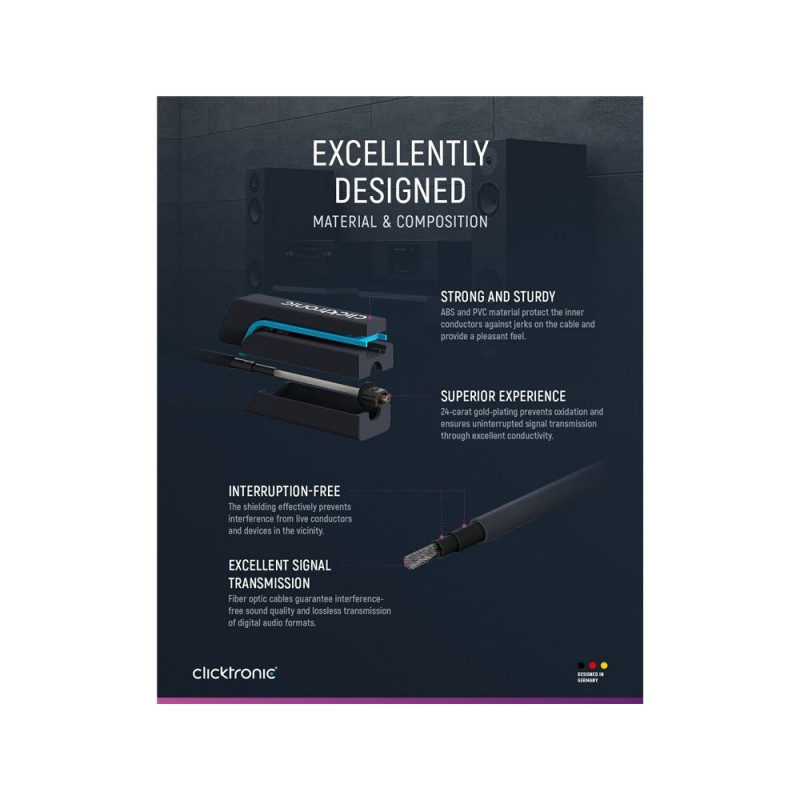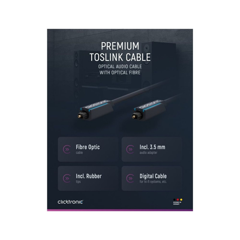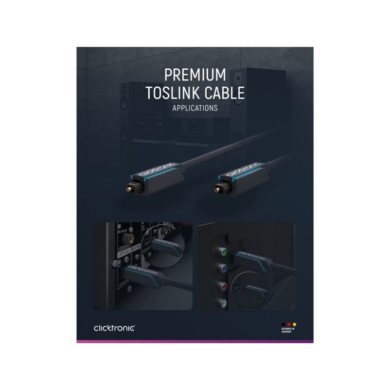 | Description | Clicktronic attaches great importance to durability and stability. Our quality promise: 10 years warranty on our Toslink cables. The proprietary construction of our connection cables makes them extremely robust. The three-part connector construction made |