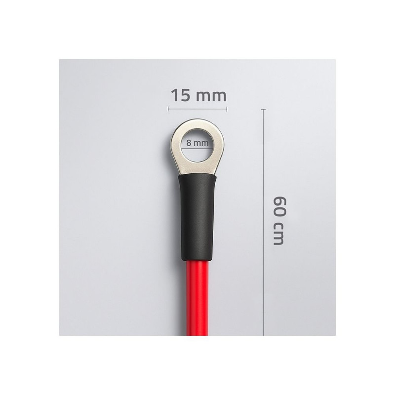 The 10AWG (approx. 6 mm) battery cable with connectors has been designed for stable and safe power transmission. The pure copper core guarantees excellent conductivity and minimal voltage loss even under high current loads. The cable is terminated with metal connectors, enabling a quick, secure and durable connection without the need for soldering or additional tools.