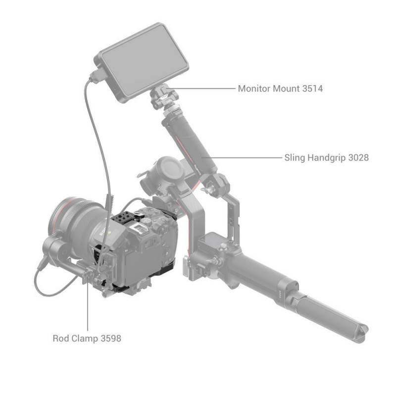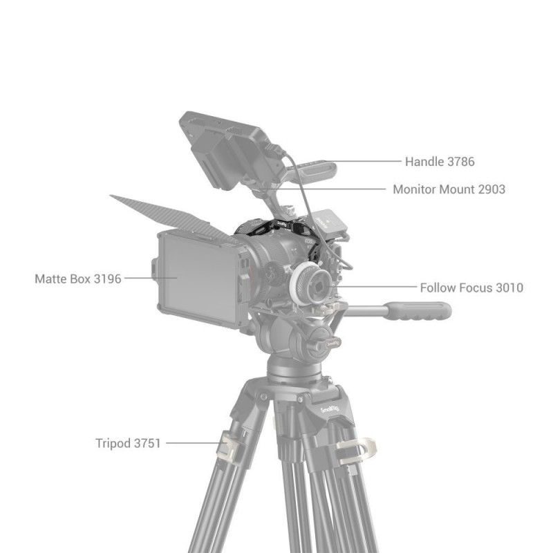 The design has clear contours around the grip, allowing full access to camera controls. It features 1/4â 20 and 3/8â 16 threaded holes for attaching accessories such as the SmallRig Top Handle 3786, SmallRig Monitor Mount 2903B and the SmallRig Side Handle HSS2425. The top ARRI 3/8" 16 locating hole allows you to attach a SmallRig Arri Locating Handle. On the cold shoe, attach a microphone or video light.