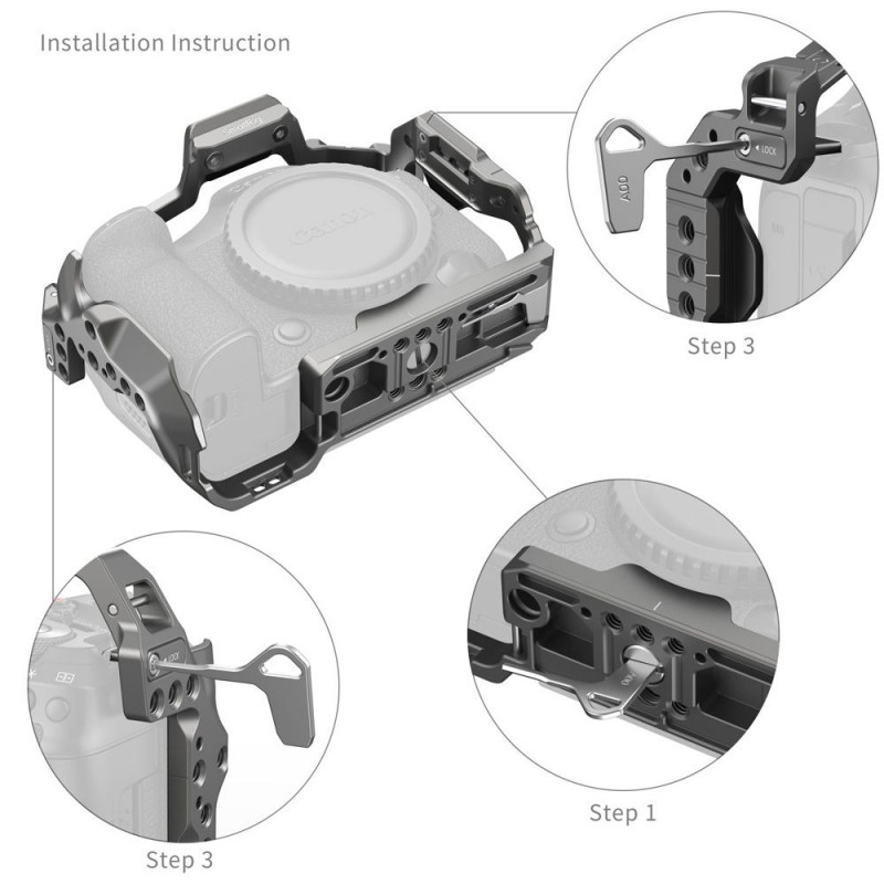 The SmallRig 4977 HawkLock Quick Release Cage for Canon EOS R5 Mark II has been carefully crafted to provide comprehensive protection and a wide range of expansion interfaces for your camera. The cage secures the camera in place with a single 1/4" 20 screw at the base and two positioning blocks at the sides, with built in silicone pads to prevent scratching the camera.