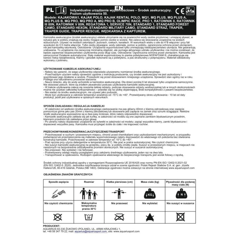 XL: waga: 70 ++kg, obwód klatki piersiowej: 117-122 cm, minimalna siła wyporu: 50 N
