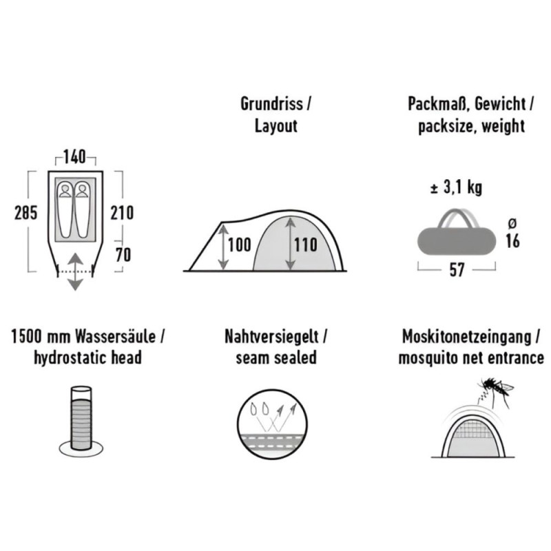 2-osobowy namiot kopułowy z przedsionkiem High Peak idealny na krótki biwak, festiwal, krótką wędrówkę. Namiot składa się z sypialni i niewielkiego przedsionka bez podłogi. Mocna, dwupowłokowa konstrukcja z wodoodporną impregnacją DWR. Montaż zajmuje zaledwie kilka chwil. W drzwiach wewnętrznych zastosowano podwójne zamki błyskawiczne (dwie warstwy materiału, w tym jednak z siatką mesh), które umożliwiają łatwe wejście i wyjście. Wewnętrzne kieszenie na drobiazgi oraz hak na latarkę. Szwy są wodoodporne i uszczelnione taśmą dla zwiększenia odporności na rozdarcia. Otwory wentylacyjne. Moskitiera.