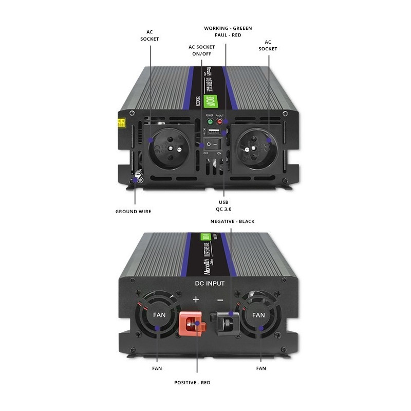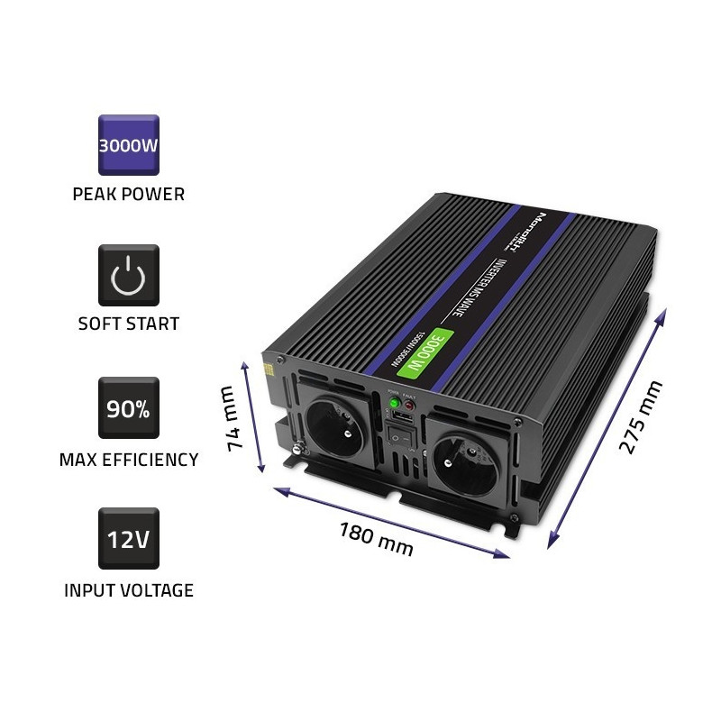 When choosing a suitable inverter, it is worth paying attention to the power value and voltage of the battery, which must be consistent with that indicated on the inverter to ensure that our equipment has the right conditions for work. Also important is the number of connected devices, for example, connecting a laptop and a printer, the power of both devices should be added up. Remember that the power consumed by the connected device should not exceed 85% of the rated power of the inverter.