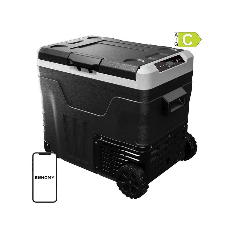 Euhomy CF003 from the CFB series is a 12V car refrigerator that combines robust cooling with the convenience of transportation. Its capacity of about 50 liters is great for family trips, weekend getaways or longer car journeys. Built-in wheels and a telescopic handle make it a mobile mini-refrigerator set that you can pull like a suitcase. The controls are intuitive thanks to the touch panel and mobile app, and the practical interior design allows you to organize every meal or your favorite drinks.