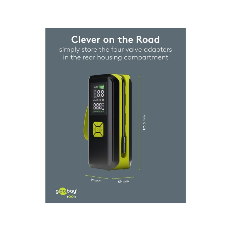 | Description | The mini compressor is a handy companion on bike rides or in the car, much more convenient than a manual bike pump and more flexible than a heavy, corded compressor for car tyres. The pump is equipped with two bright LEDs for reliable use in the dark. |