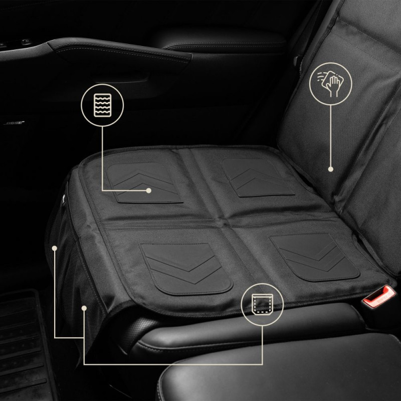 This product is intended to protect car seat upholstery in passenger vehicles from dirt, dents, and abrasion caused by the installation of a child seat. Especially recommended for families with small children who regularly use ISOFIX or belt-mounted seats. It can also serve as a practical protective mat when transporting pets—effectively shielding the seats from fur, mud, and potential scratches, improving travel hygiene and comfort.