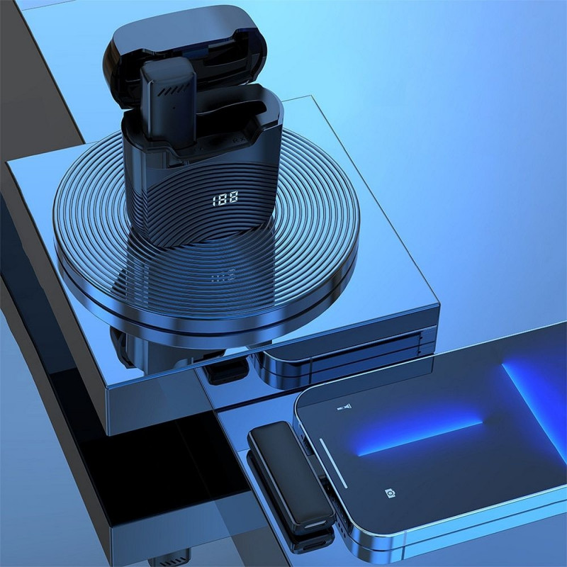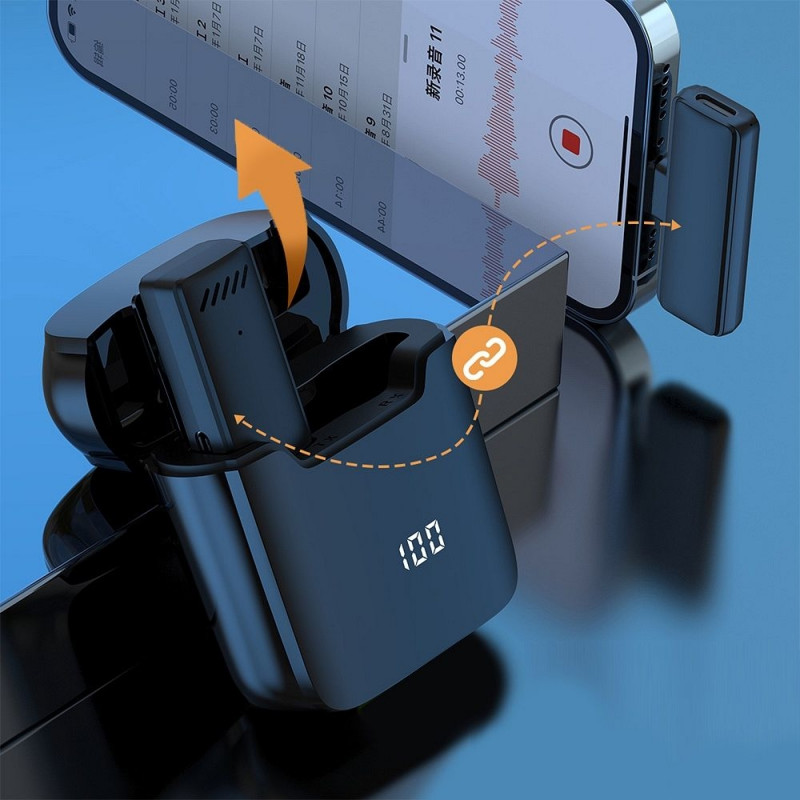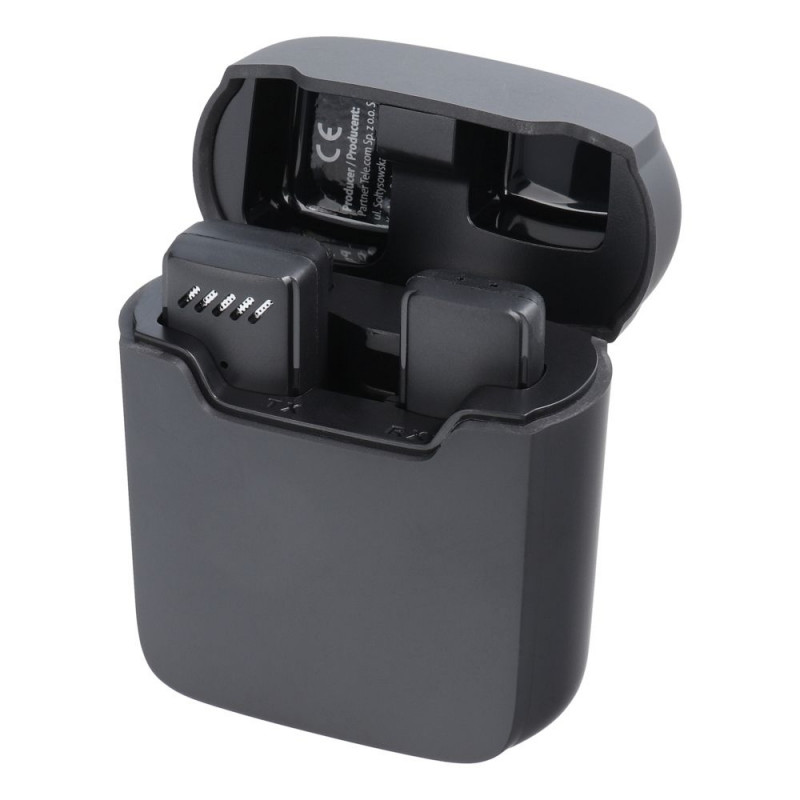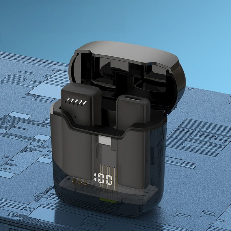 A wireless microphone with a USB-C connector is a device that will help you make recordings both outdoors and indoors. The compact form and the ability to attach to clothes make it suitable for vlogs and conducting broadcasts or interviews. The charging case with a LED display included.