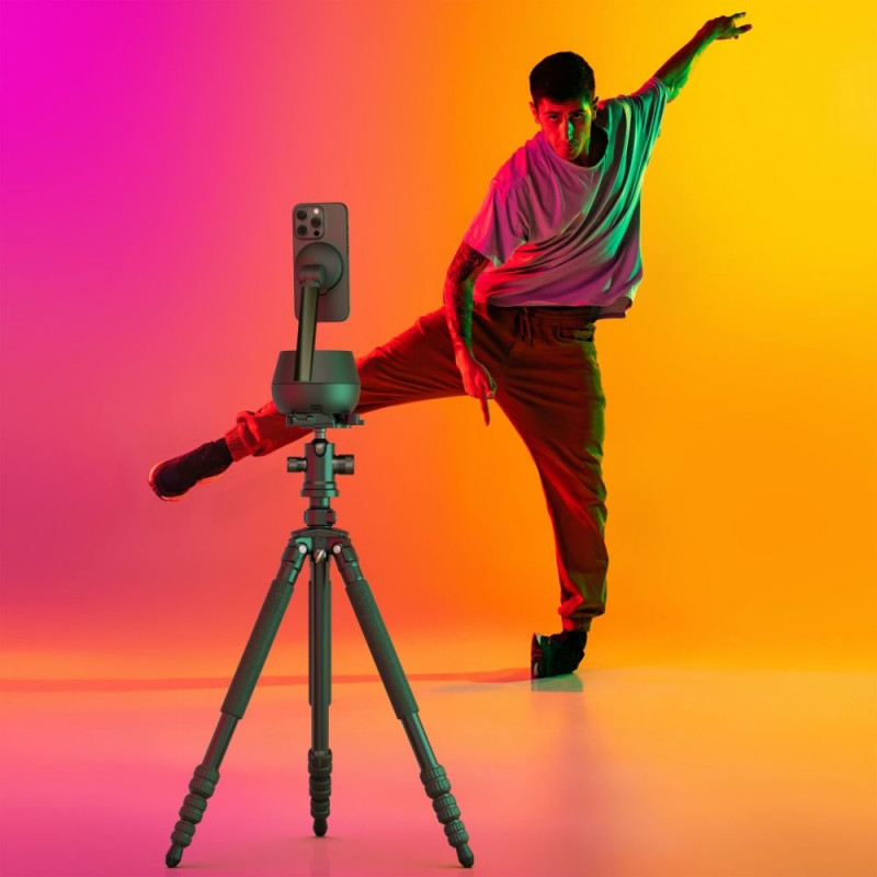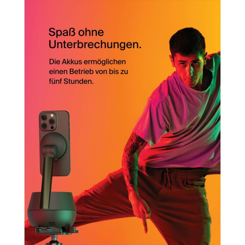 The easiest way to FaceTime, create action-packed videos, and go hands-free for livestreaming and video conferencing is here. Our Auto-Tracking Stand Pro follows your face and body movements with 360° rotation and 90° tilt with smooth, quiet motors. Grab and go - the internal battery offers 5 hours of operation on a full charge.