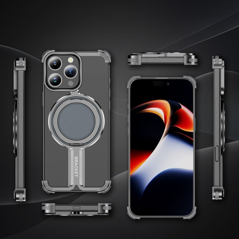 The Titanium Bracket case features durable aluminium construction, an integrated ring stand, reinforced edges for shock protection, and a raised rim for enhanced camera protection. Additionally, it supports magnetic holders and stands out with its modern design.