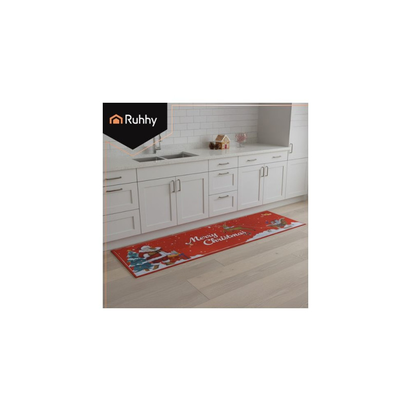 Poczuj magię świąt w każdym kroku ? wybierz miękki chodniczek RUHHY 160×50, który łączy styl, ciepło i bezpieczeństwo!- Natychmiastowy klimat świąt efekt w kilka sekund - Wystarczy rozłożyć chodniczek, by kuchnia czy przedpokój nabrały ciepła i przytulnego blasku. Motyw Merry Christmas natychmiast tworzy świąteczny nastrój bez dodatkowych dekoracji.