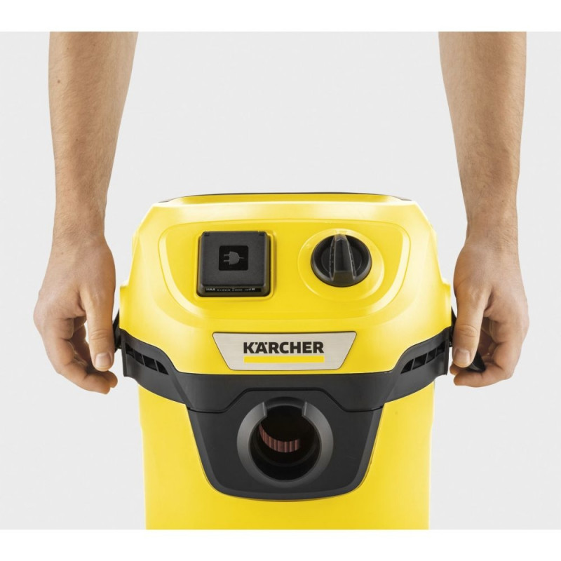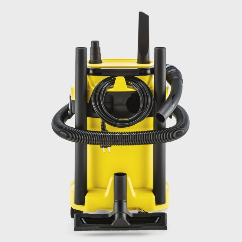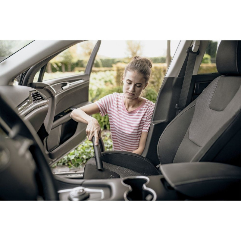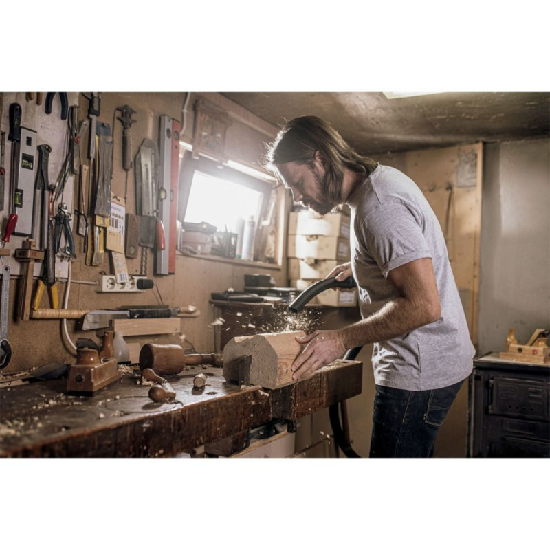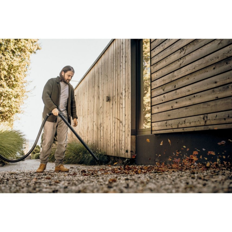 The WD 3 P V is powerful and energy-efficient with power consumption of only 1000 W. The machine as well as the suction hose and the Clips floor nozzle are perfectly matched - for the best cleaning results on dry, wet, fine or coarse dirt. The wet and dry vacuum cleaner impresses with its compact design and a robust 17 l plastic container, 4 m cable, 2 m suction hose and fleece filter bag. Thanks to the single-piece cartridge filter, it is possible to vacuum both wet and dry dirt without filter replacement. Via the integrated power outlet with automatic on/off switch, power tools such as saws or grinders can be connected and the arising dirt can be suctioned directly. The blower function is useful for cleaning areas that are difficult to access. The hose is stored by hanging it on the machine head, thus saving space. The cable can be stored on the cable hook, tubes and floor nozzles at the bumper. The "Pull & Push" locking system allows the simple opening and closing of the container. The handle of the vacuum cleaner can be removed and the accessory can be connected directly to the suction hose.
