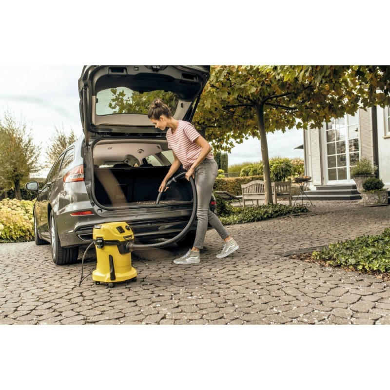 Perfect for the hobby workshop: The WD 3 P V impresses with 17 l plastic container, 4 m cable, 2 m suction hose, single-piece cartridge filter and power outlet for working with power tools.
