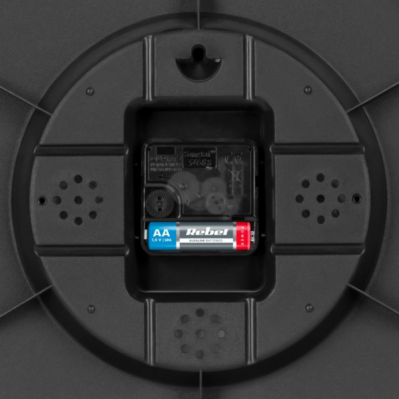 Wygodne zasilanie bateryjneZegar zasilany jest za pomocą standardowej baterii AA, co sprawi, że jest wyjątkowo łatwy w użytkowaniu. Brak przewodów sprawia, że można go umieścić w dowolnym miejscu ? wystarczy zawiesić go na ścianie, wykorzystując praktyczny otwór montażowy. Energooszczędny mechanizm pozwala na długotrwałą pracę na jednej baterii, minimalizując konieczność częstej wymiany.