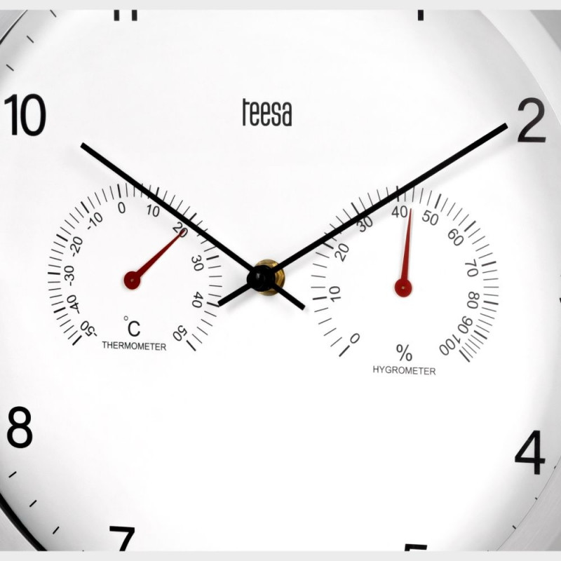 Wbudowany termometr i hydrometrOprócz precyzyjnego wskazywania czasu, zegar Teesa został wyposażony w praktyczny termometr oraz hydrometr. Dzięki nim w każdej chwili można sprawdzić temperaturę oraz poziom wilgotności powietrza, co jest szczególnie przydatne w domach, biurach czy warsztatach. To doskonałe narzędzie do dbania o optymalne warunki otoczenia, sprzyjające zdrowiu i komfortowi użytkowników.