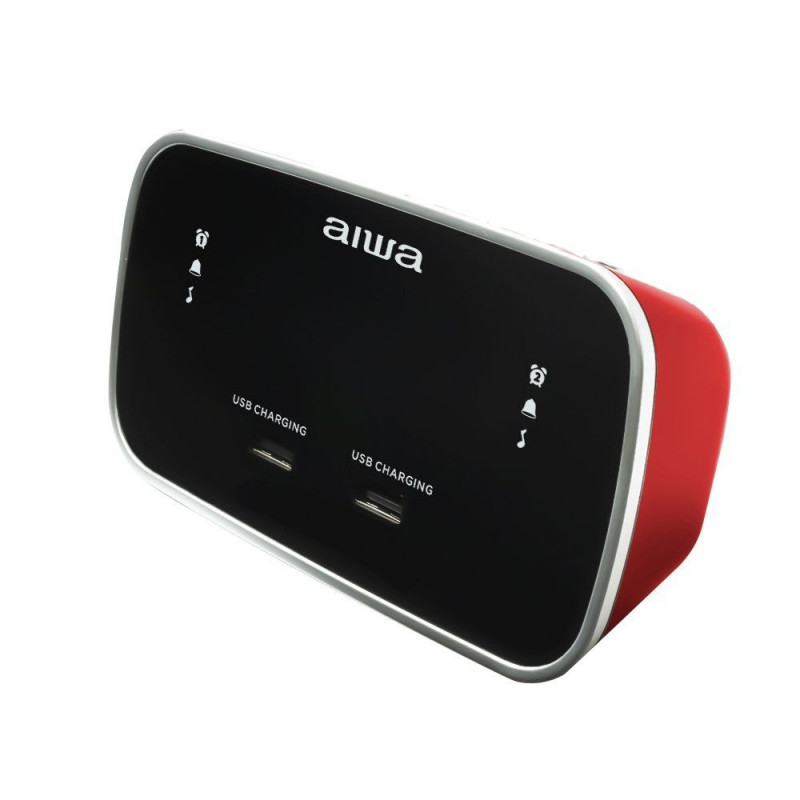 Compact desktop alarm clock with a 0.6" red LED display. Features dual alarm, snooze function, sleep timer, and adjustable display brightness. The built-in FM tuner supports 10 station presets and can be used as an alarm source. Two USB ports allow convenient device charging. Powered by AC mains with CR2032 battery backup for saving settings during power outages.