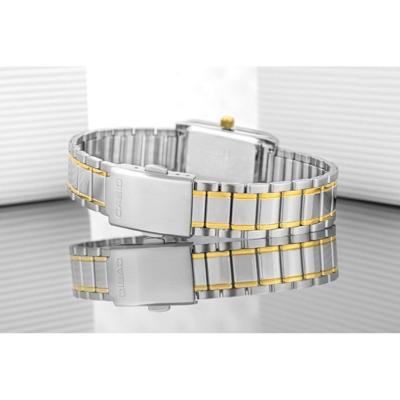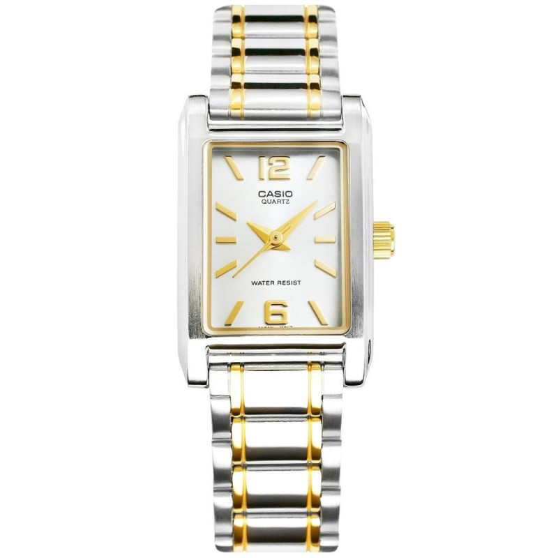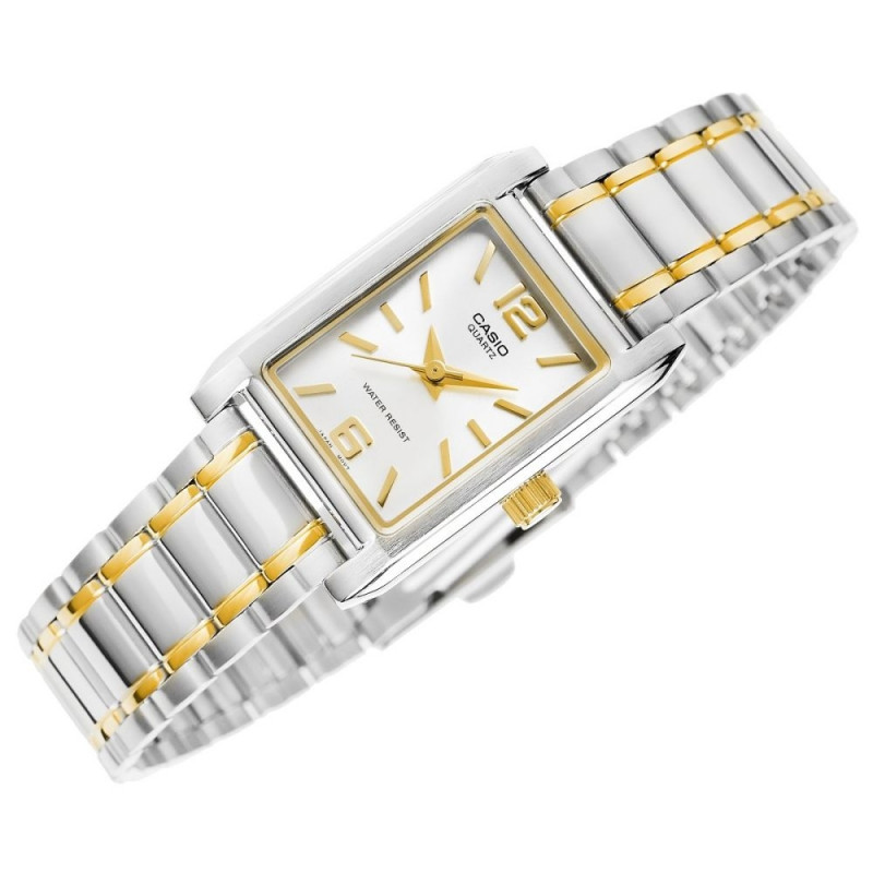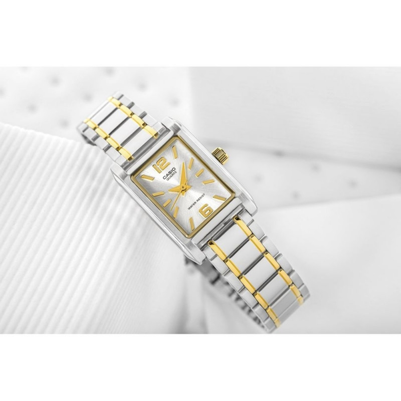 The Casio LTP-1235SG-7ADF is a refined ladies’ watch featuring a slim rectangular case and a stylish two-tone stainless-steel bracelet. With its elegant combination of silver and gold accents, the design suits both daily wear and more formal occasions.