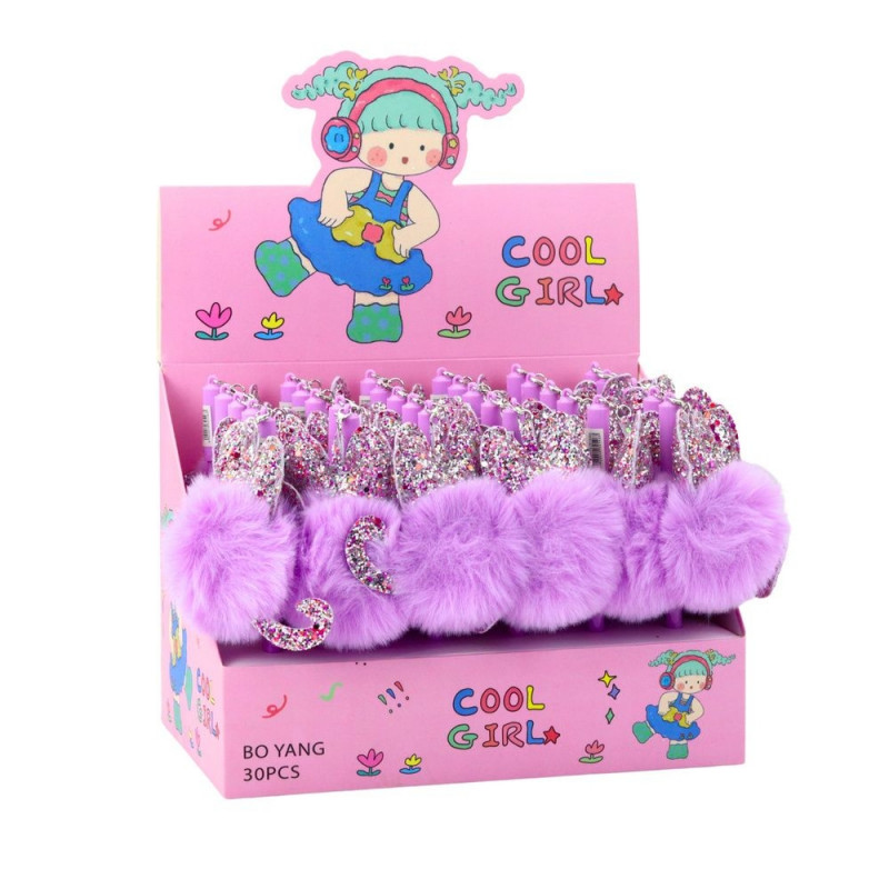 DŁUGOPIS ŻELOWY Z FIOLETOWY POMPONEM 17 CM / NIEBIESKI TUSZ