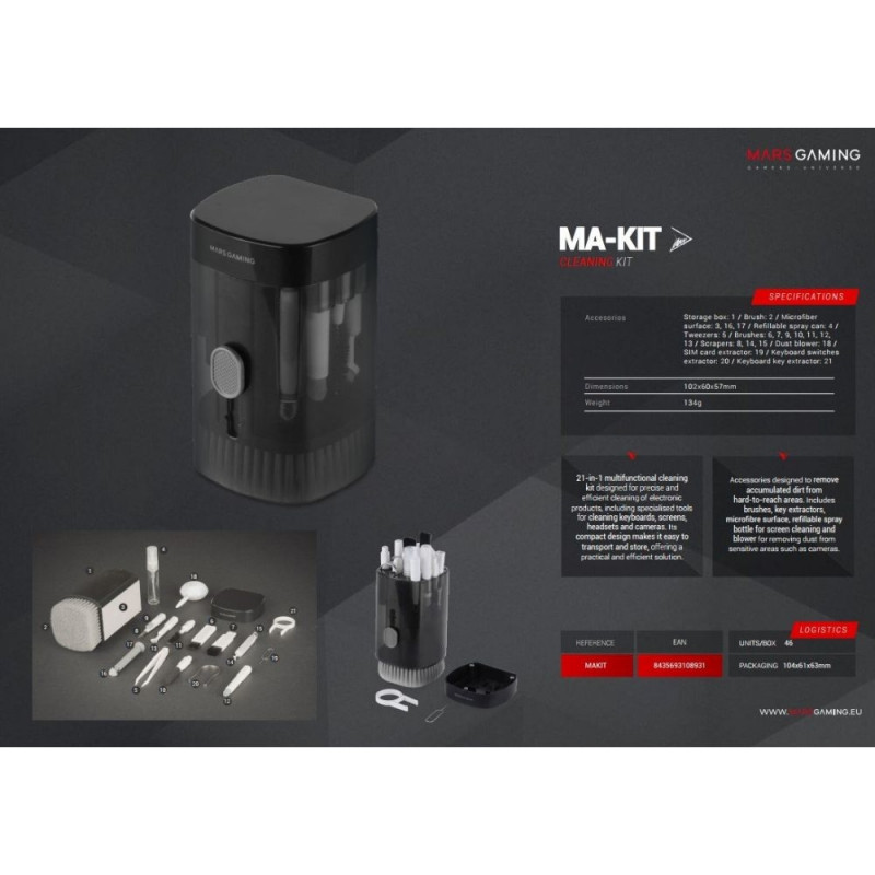 The 21-in-1 MA-KIT Cleaning Kit is the ultimate solution for maintaining your electronic devices. Designed for professional performance, it includes specialized tools for cleaning keyboards, screens, earbuds, and more. Each accessory serves a specifiWarning: Last items in stock!