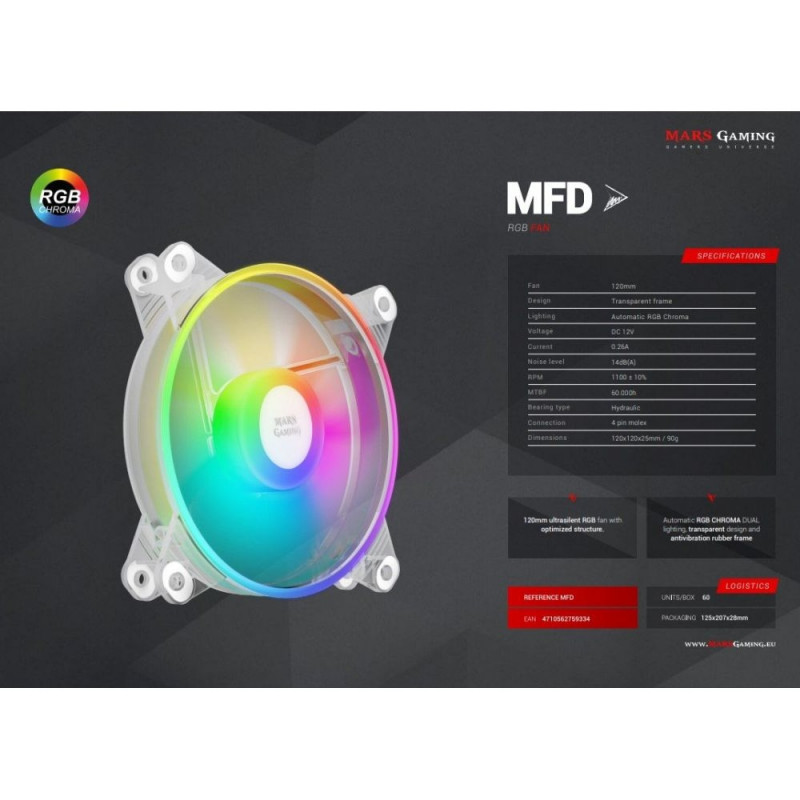 Mars Gaming MFD PC Cooler 12 cm - Ultra-quiet 14db - AUTO CHROMA RGB AUTO 120mm fan - MOLEX 4PIN connectivity - Anti-vibration system Main features: - 120mm fan diameter - 9-14 dBA - MAX 1100 ± 10% RPM - 4-pin fan connector Dimensions: WiWarning: Last items in stock!