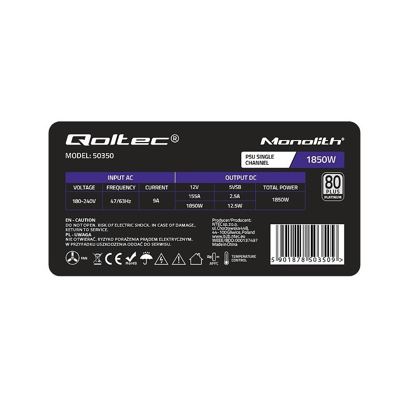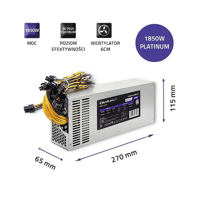 Qoltec 50350 power supply 1850W PCI-E| 80 Plus Platinum | Gaming Miner