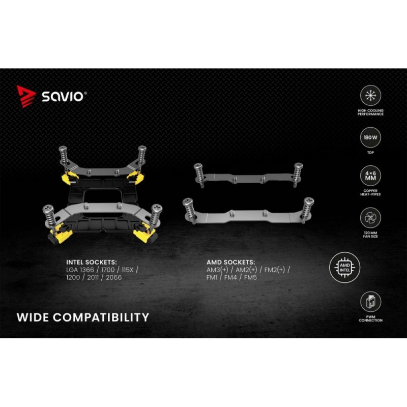 Heat pipesThe cooling from Savio is equipped with 4 efficient heat pipes, which ensure fast and efficient removal of heat from the surface of the CPU. This translates into lower operating temperatures and more stable system performance. Whats more, each heat pipe is made of copper, which guarantees high thermal conductivity, and their proper placement increases the surface area for efficient temperature dissipation.