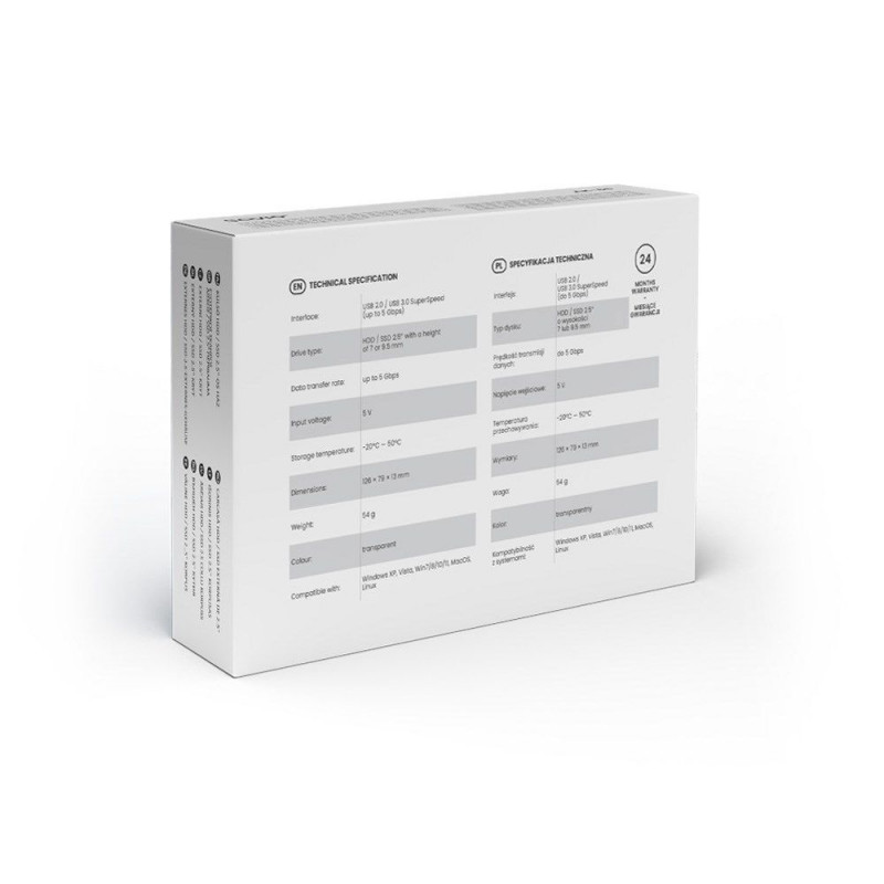 The Savio 2.5" External HDD/SSD Enclosure features a transparent design, providing clear visibility of the storage drive inside. This enclosure supports up to two storage drives (HDD or SSD) and is compatible with USB 3.0 interfaces for fast data transfer.